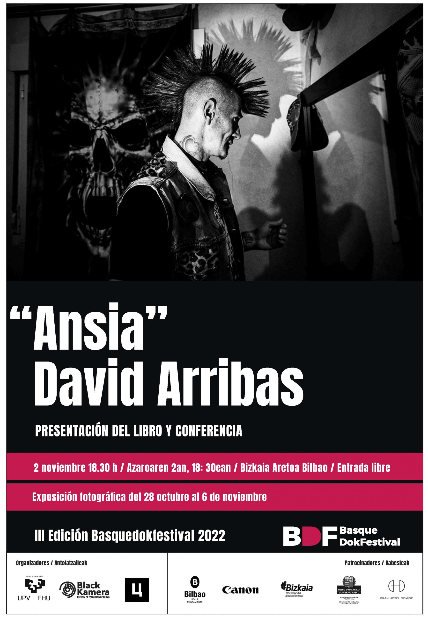 Presentación de la exposición y el libro "ANSIA" de DAVID ARRIBAS. Lugar Bizkaia Aretoa Entrada libre 18:30 20:00 Exposición "Ansia" de David Arribas, abierta al publico del 28 de Octubre al 6 de Noviembre https://basquedokfestival.com/team-member/david-arribas/ Compra entradas del Festival